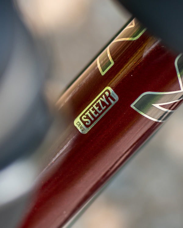 FRAME; All-New SteezyR Double Butted CrMo, Beyond Road Geometry, Tapered Headtube w/ Integrated Headset, Investment Cast Dropouts, Thru-Axle, Disc Brake, Fender and Rack Mounts and Hidden Kickstand Mount (adapter sold separately)